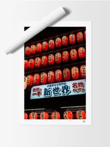Découvrez Lumières de Shinsekai, une photographie emblématique prise de nuit à Osaka, au cœur du quartier rétro et vibrant de Shinsekai. Cette composition met en scène des lanternes japonaises rouges suspendues, symboles de tradition et de chaleur, éclairant la scène d’une lumière douce et immersive.